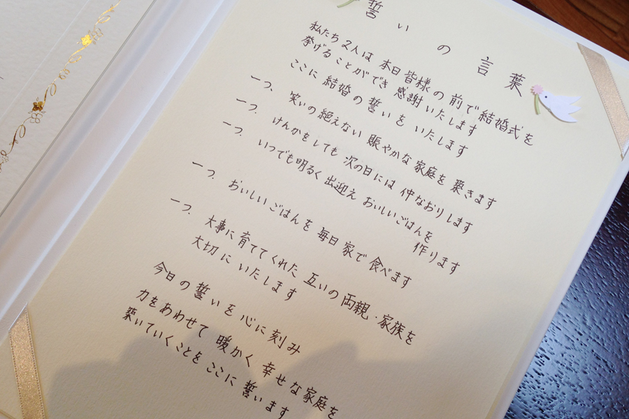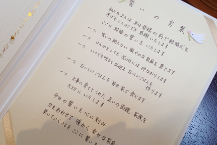 人前式の誓いの言葉。お互いの家族を大切にします!心を添わせて宣誓したおふたりの声はピッタリと揃う。おふたりらしい♥ リングリレーセレモニーで参加型の人前式に。
