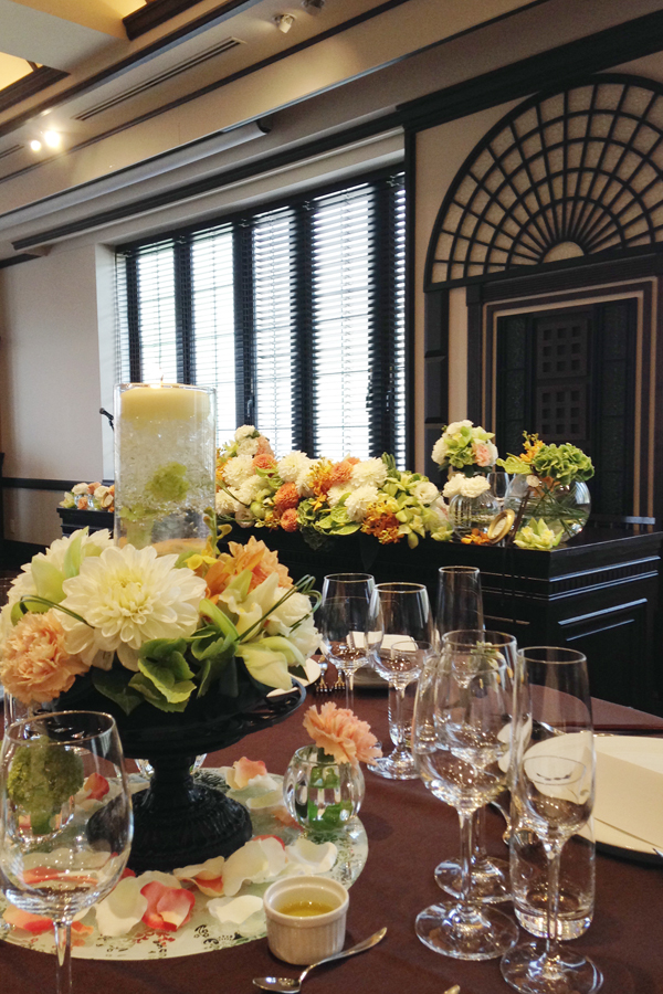 皆様とお話する時間を多くもちたい。そんな想いから衣裳は1点。挙式はベール&アップスタイル、披露宴は花冠&ダウンスタイル。皆様をお待たせしないようにしたい。そんなおふたりの心遣いを感じます。