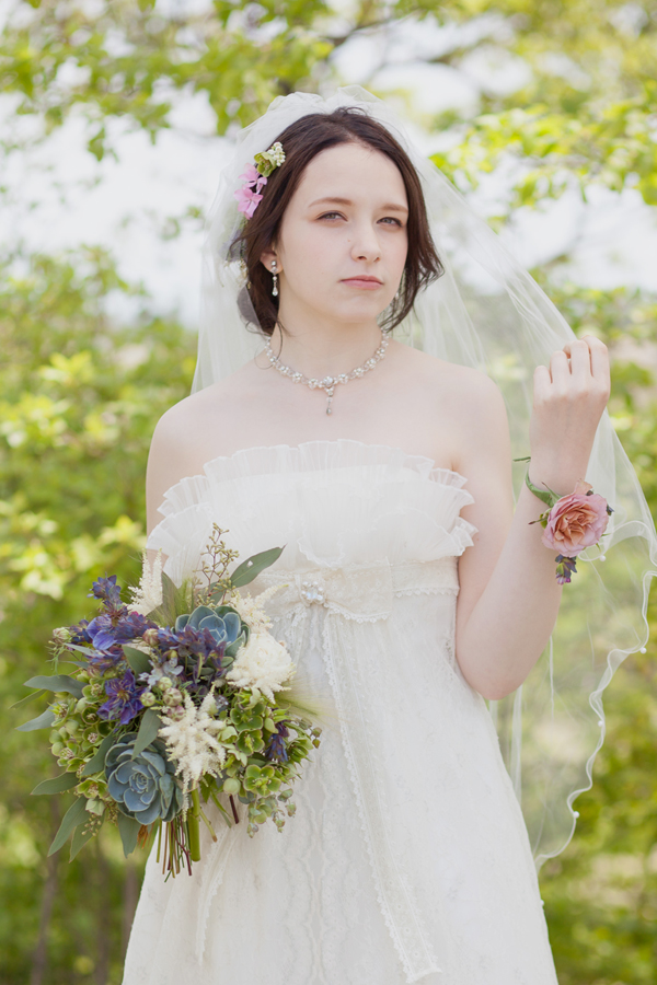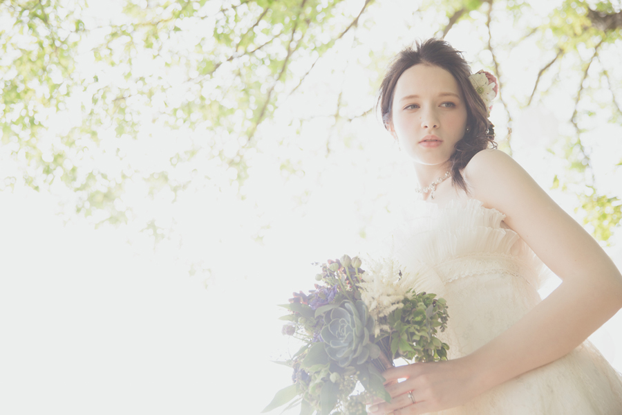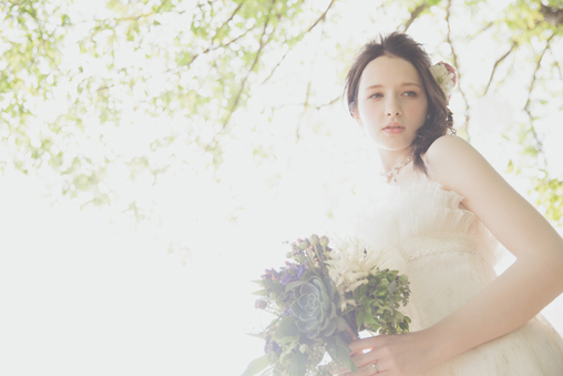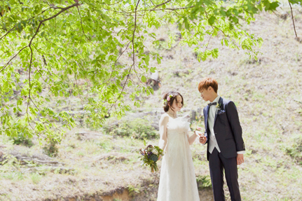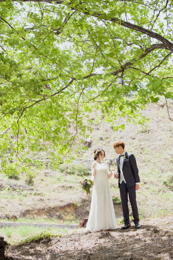 「Forest Green Wedding」がコンセプト。深い木々のグリーンや優しい自然の光に包まれるおふたりをイメージしたショットです。ブーケやヘッドパーツに至るまで、イメージを全員で共有してからオーダー。