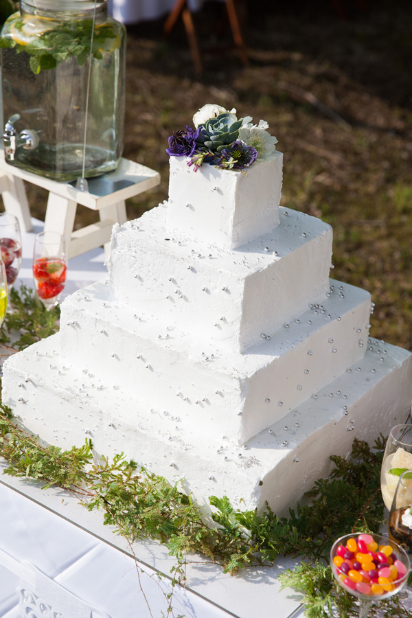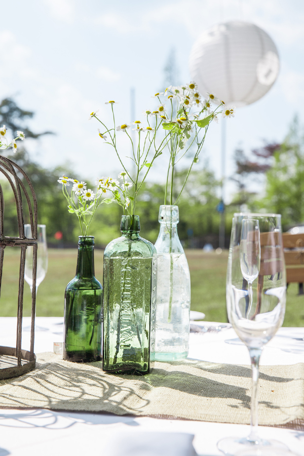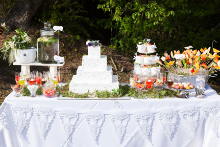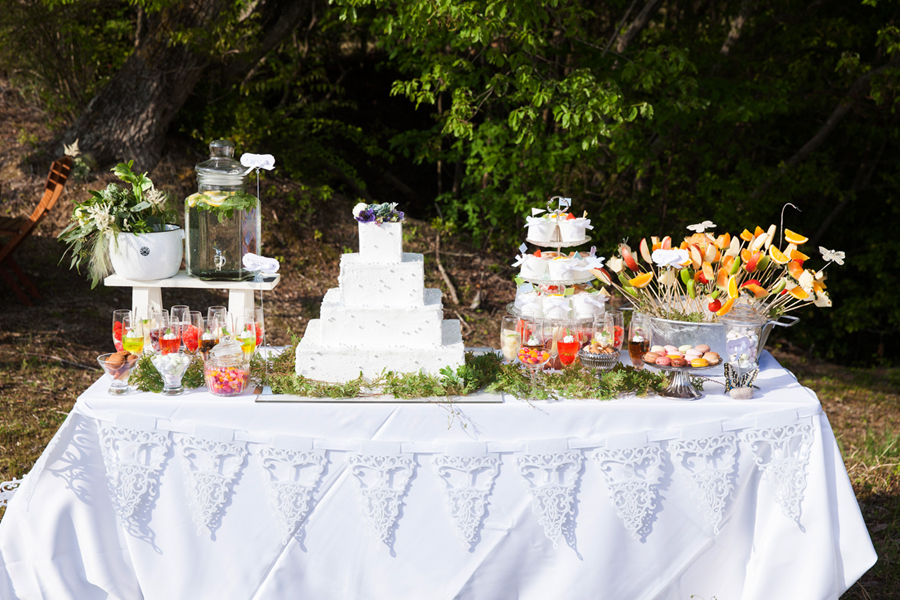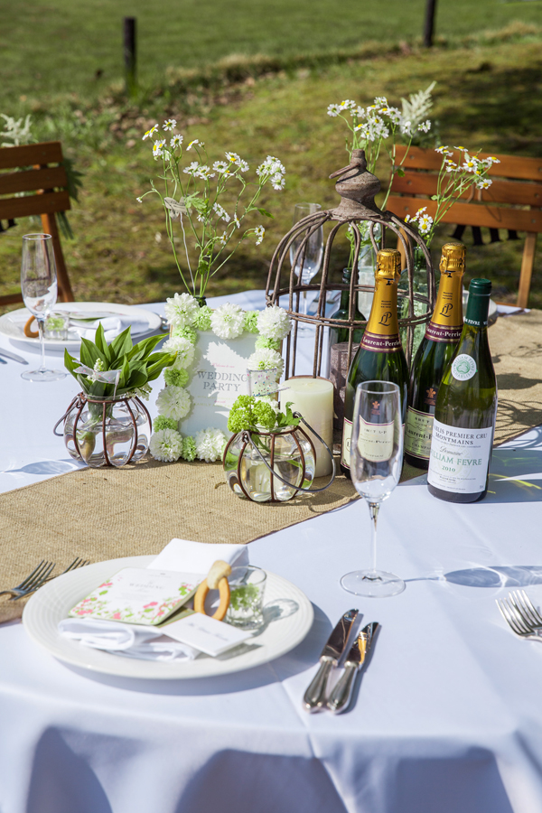 ガーデンらしく麻のテーブルランナーをチョイス。撮影のためだけに指輪モチーフのクッキーも焼いていただきました。テーブル中央のデコレーションがこっち側だけ向いてるなんて…実際ならあり得ませんよね(笑)