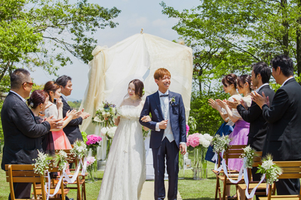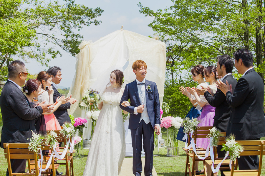ゲストチェアーや麻のバージンロード、装花などこだわりあふれるガーデンウエディングショット。ゲスト役にはクライアント様のスタッフの方々がエキストラ出演です。まるで本当の式みたい!?