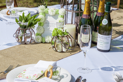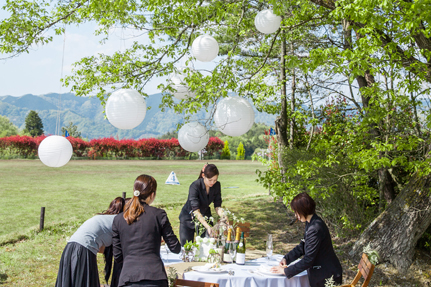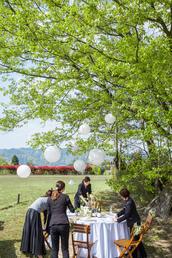 木の下でのテーブルセッティング。高い木からバランス良くランタンを吊る作業には、クライアントの皆様にまでご協力いただきました。後ろに写っているゴルフ場らしいものもポイントです。