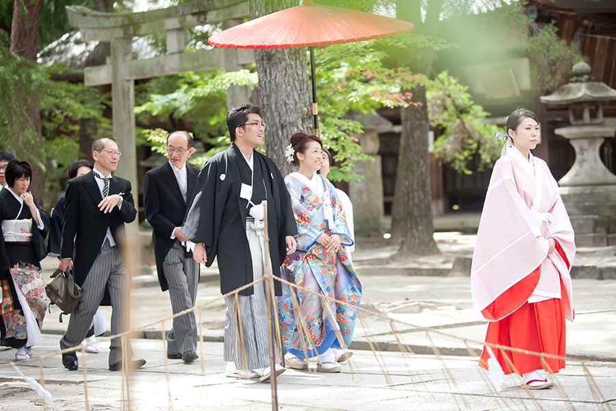 | COMMENT | 大学時代からの10年間友達だったんですよ。気さくに沢山のお話をしてくれるHitomiさんと温かい眼差しで見つめるKosukeさん。出会う前からの共通点がとても多いおふたりには、大切な家族、大切なお友達がたくさん。み~んなが繋がるような結婚式にしたいんです。そうお話してくれたおふたり。挙式をあげた今宮神社は、Kosukeさんたってのご希望。祖父母宅の氏神さまとしてご縁のある神社を起点に、親族とのご会食、ご友人とのウエディングパーティ。おふたりの結婚式は、涙あり笑顔あり、感動の2日間となりました。 |