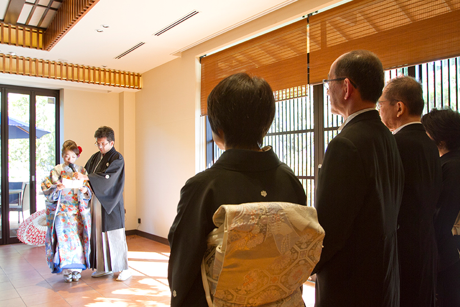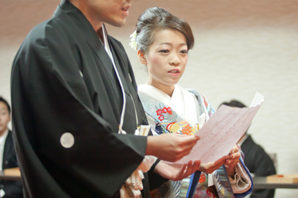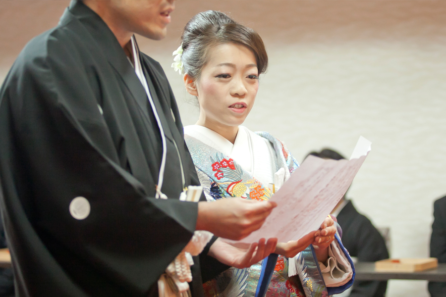 神社挙式の式次第に含まれる意味、作法の意味、向かう心得など事前にしっかりお伝えしたおふたり。誓詞は暗記するほどしっかりおふたりで読み込んで練習。三三九度、柏手、指輪交換も完璧!真摯に向き合ったからこそ、感動する挙式に!