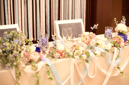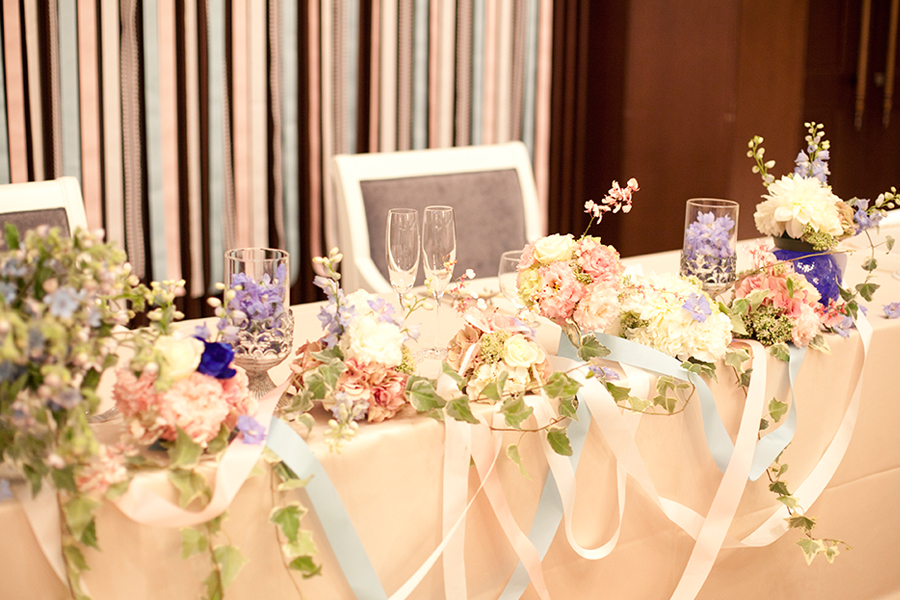 2日間のメインテーマは「融合」。1日目は和装でしっとり家族とともに。2日目は洋装で賑やかに私たちらしく。衣裳も会場装飾もガラリと変えて…。2日目はパズルのピースとリボンがおふたりのパーティを盛り上げるアイテムに!