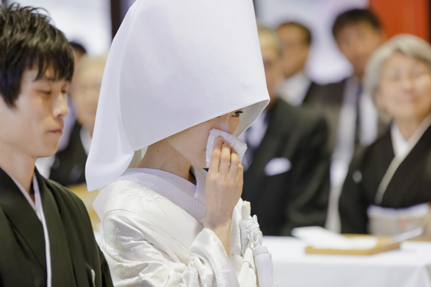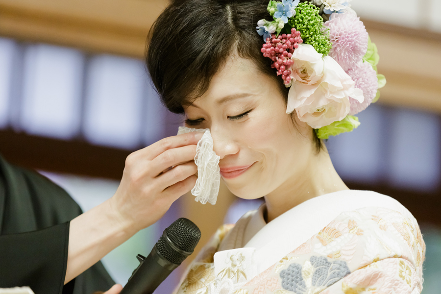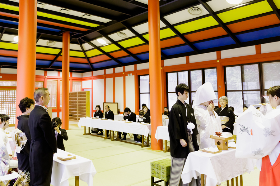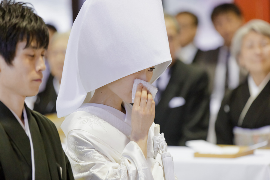 宮司さまの祝詞が心に染みわたる。三々九度の由来や意味が分かるからこそ溢れ出す涙。新郎さまの「誓詞」を読み上げる力強い声。そっと添えられた花嫁様の声。宮司さまのお言葉が心に響く。気高い空間がさらに変わる。これこそ本来あるべき神前式の形。