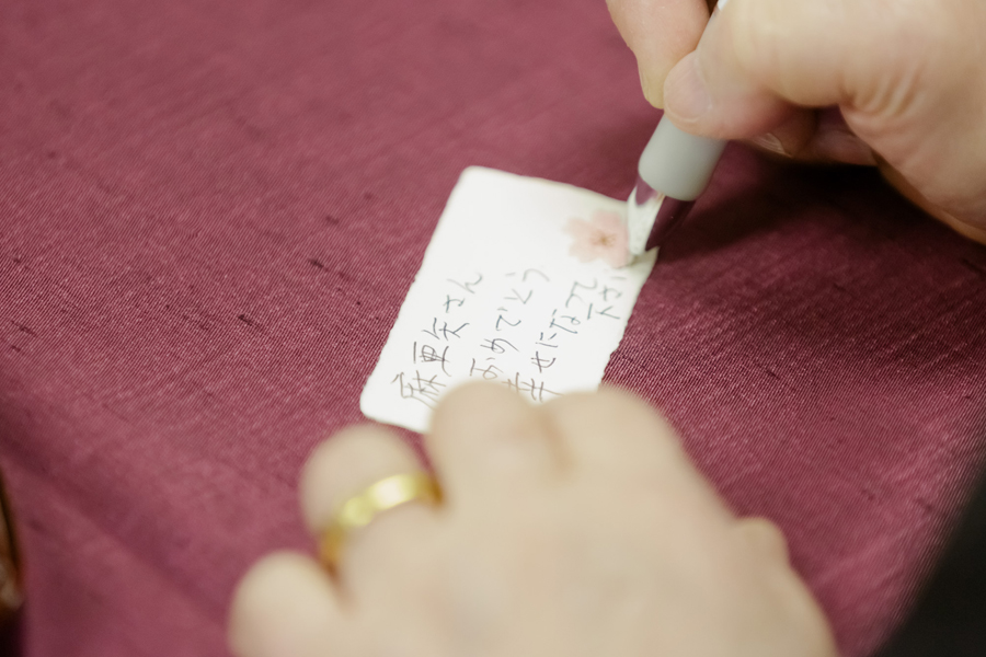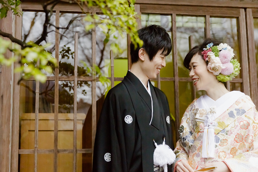 紋付袴に家紋を背負うYoshikiさん。相良刺繍の白無垢から唐織の色打掛へ、日本の伝統の衣裳を身にまとったMaayaさん。招待状、装花、引出物、演出にいたるまで、自然が大好きなおふたりらしい優しい雰囲気が溢れています。