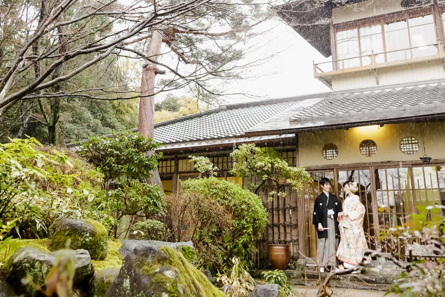 挙式後のご会食は、堅苦しい披露宴形式ではなく、親族が集まってお食事を楽しむなごやかな雰囲気と自然を感じる静かな場所が良いとご希望されたおふたり。1万坪の庭園と美味しいお料理が自慢の料亭百楽荘は、そんなおふたりにピッタリの会場です。
