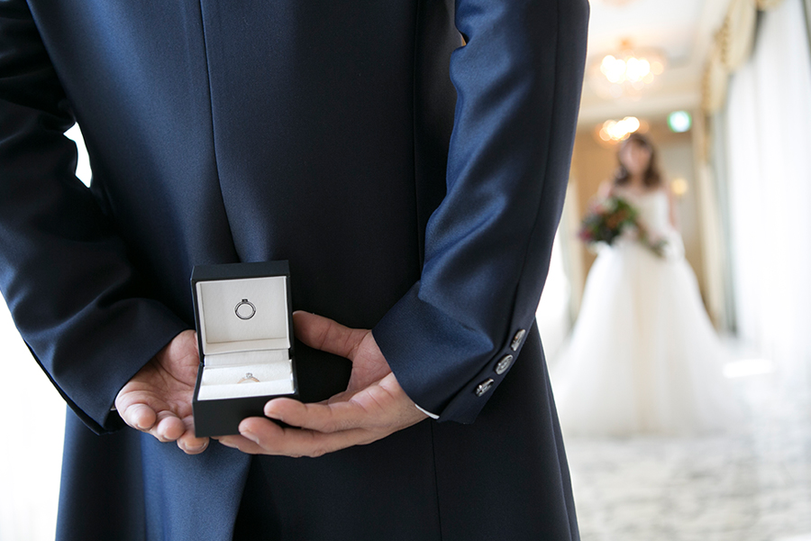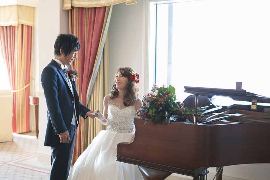 ファーストミートからはじまる撮影。スイートルームやエントランスなど館内でのゆったりした撮影は平日・前撮りならでは…。ご両親へウェディングフォトをプレゼントされたおふたり。この日は新郎新婦さまが2組。