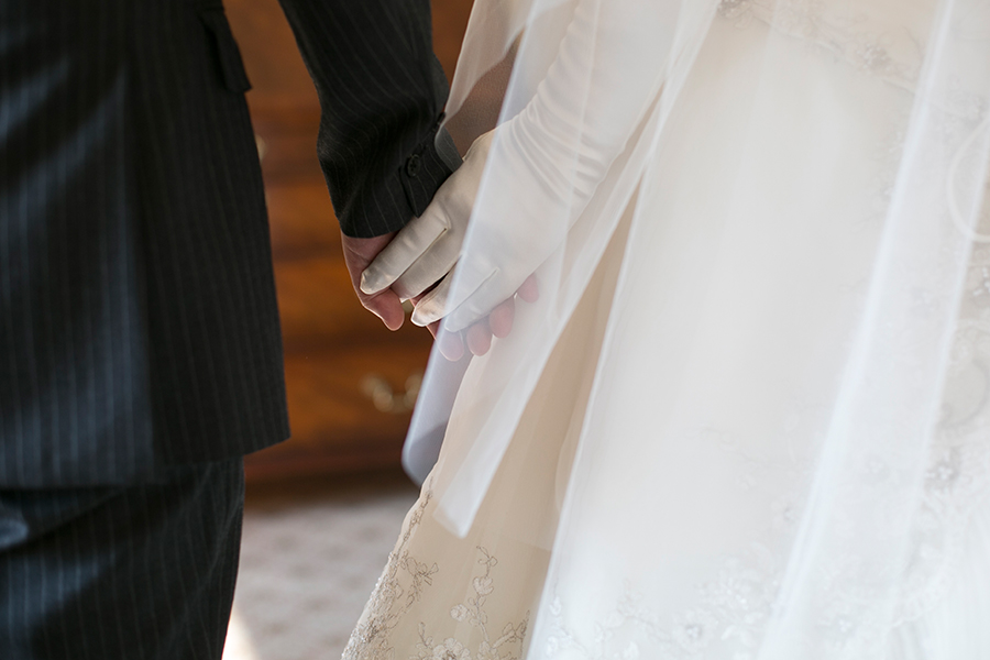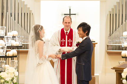 迷わず決めた挙式スタイル。新婦お母様によるベールダウンセレモニー後、お父様に導かれてゆっくりウェディングロードを進む。目線の先には新郎Ryotaさん。指輪がうまく入らなくて…笑みが溢れるおふたりが印象的。