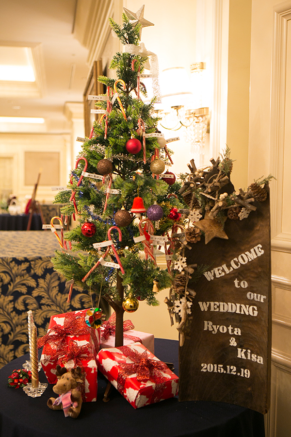 お友達が作ってくれたクリスマスウェルカムボード。ツリーに吊ったエスコートカード。まつぼっくり席札。メイン&ゲストテーブルにも、赤と白のキャンドル、オーナメントを持ち込んでホテル装花をよりクリスマス仕様に。沢山の想いが詰まっています。