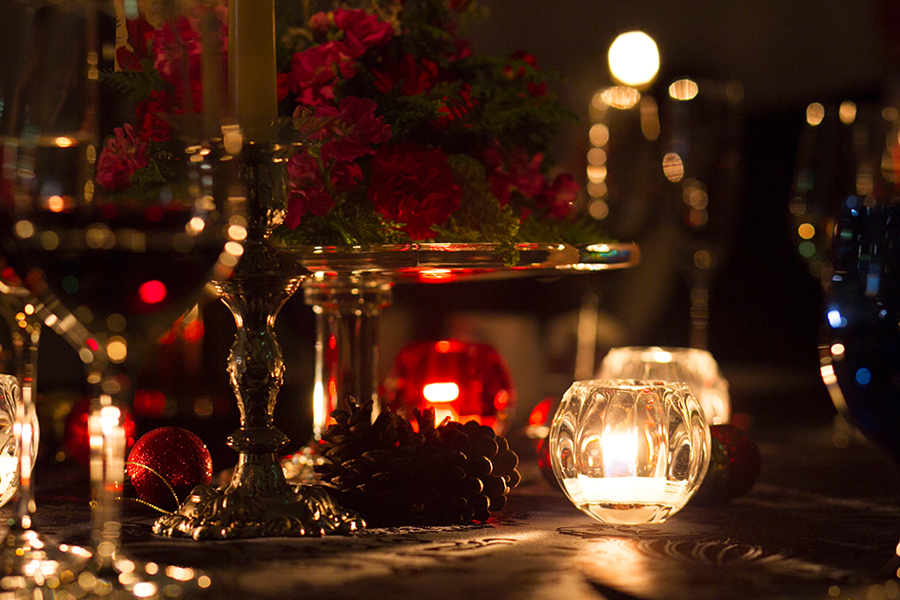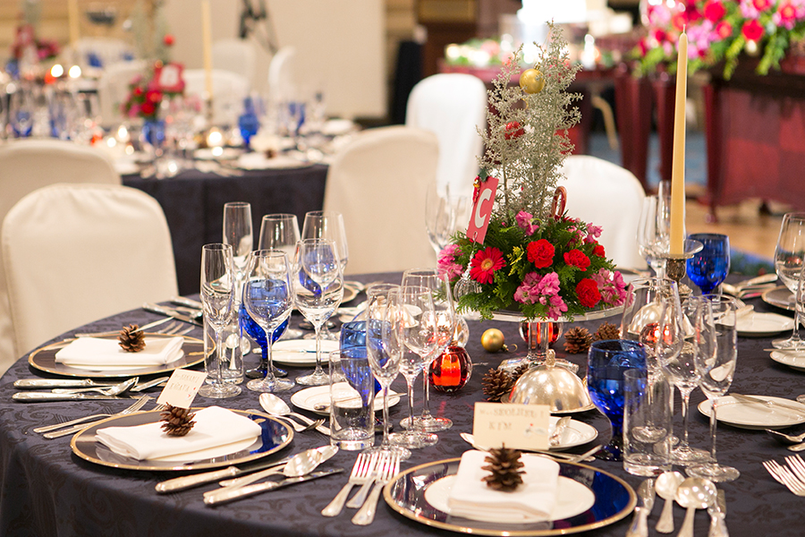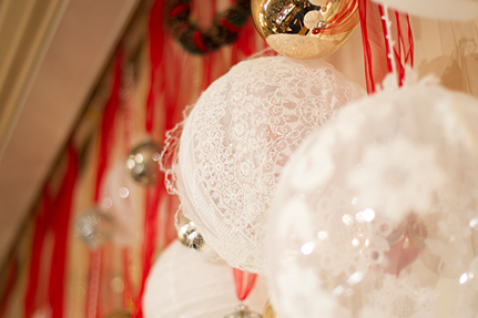 レース屋さんにお勤めの新婦Kisaさん。店舗ディスプレイとして使われているレースボールにクリスマスオーナメントを追加してオリジナルのバックドロップに。メインテーブルにより華やかさを添えます