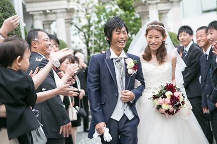 花の香りで清め、悪魔や災難から2人を守り、幸せを祈るフラワーシャワー。「みんなから祝福されているのを一番感じた瞬間かな~」とお話しくださったおふたり。ご列席いただいたみなさまの笑顔と暖かな拍手で幸せいっぱい