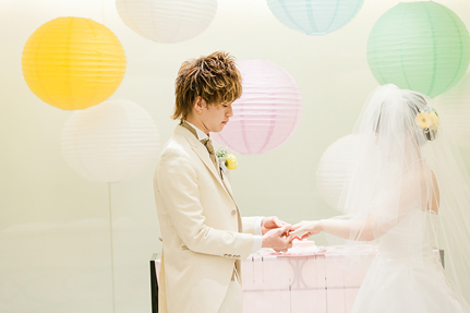 コンセプトカラーはパステルレインボー。真っ白なセレモニールームをふたり色に染めるため全員でカラーランタンを吊ったからこその空間。リングピロ―やキャンディブッフェ、小さな小物に至るまでイメージカラーで統一。