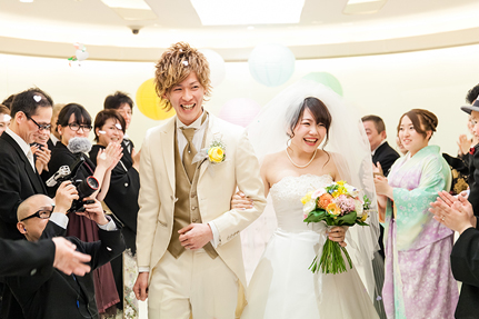 幸せ感を共有させてくれるふたりの笑顔。ハート型のペーパーシャワーで祝福。外で待機していた仲間たちはリボンワンズで祝福をプラス。人前式後はカクテルパーティへ。