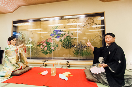 | COMMENT | 酬恩庵一休寺のライトアップなどを手掛ける照明デザイナーの新郎Taketoshiさん。細部に渡る心遣いと優しさに溢れる新婦Yukoさん。