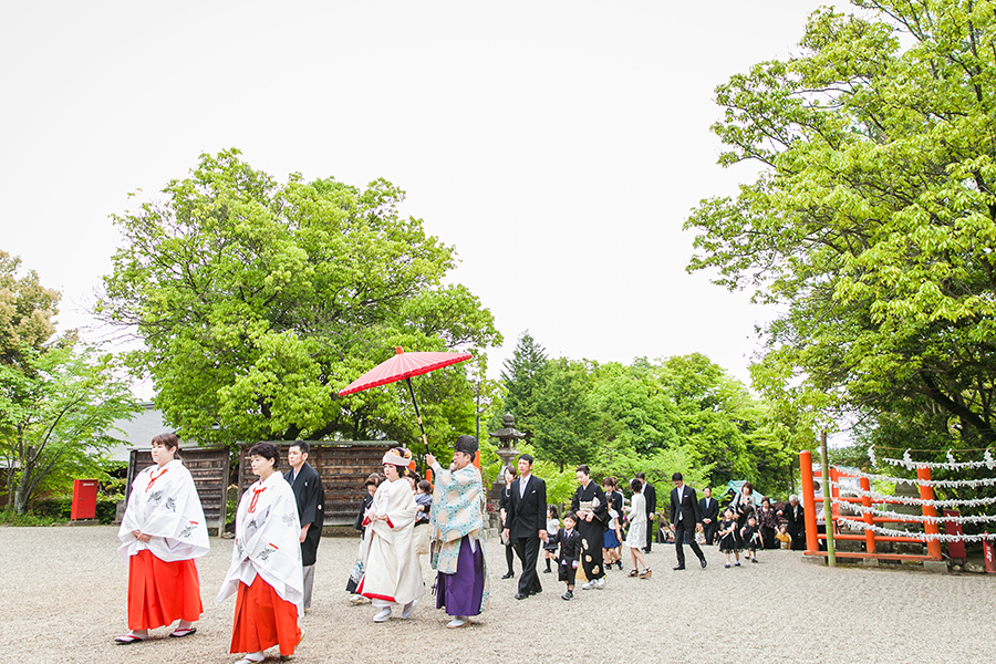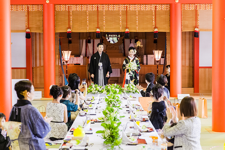 そんなおふたりとのご縁を繋いでくれたのは、共通の友人。色々なことをお話しする中で、大好きな場所でもある「風神 龍田大社」へ一度参拝し、体感してきてください~とお話しさせていただいたことがきっかけ。新婦Akiさんのお母様の溢れる想いも受けて、龍田大社の宮司さまをはじめ、沢山の方々のご協力を元に迎えた結婚式当日。