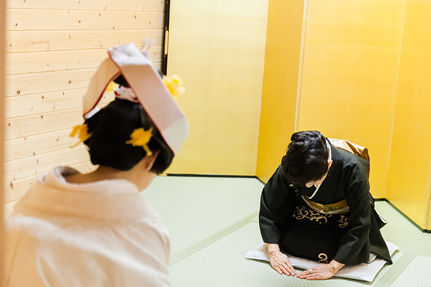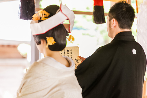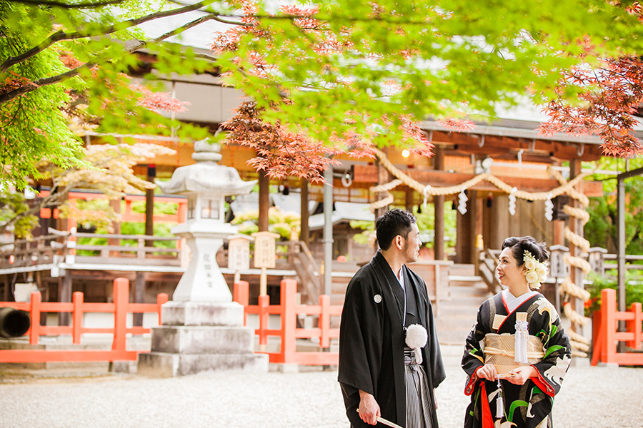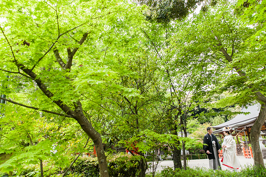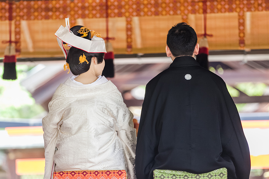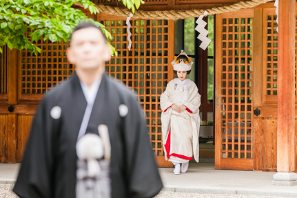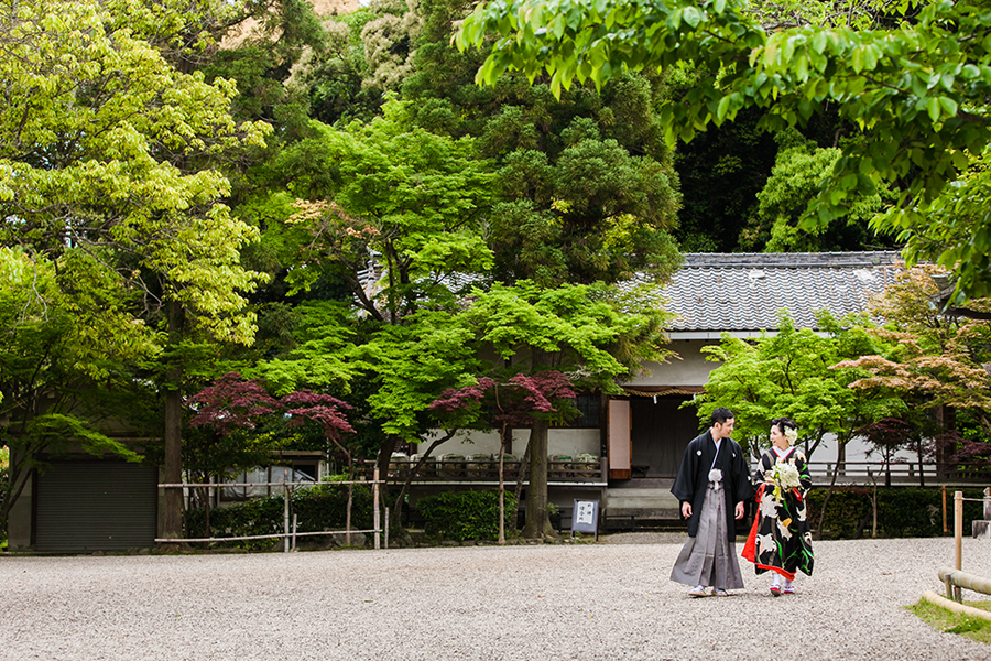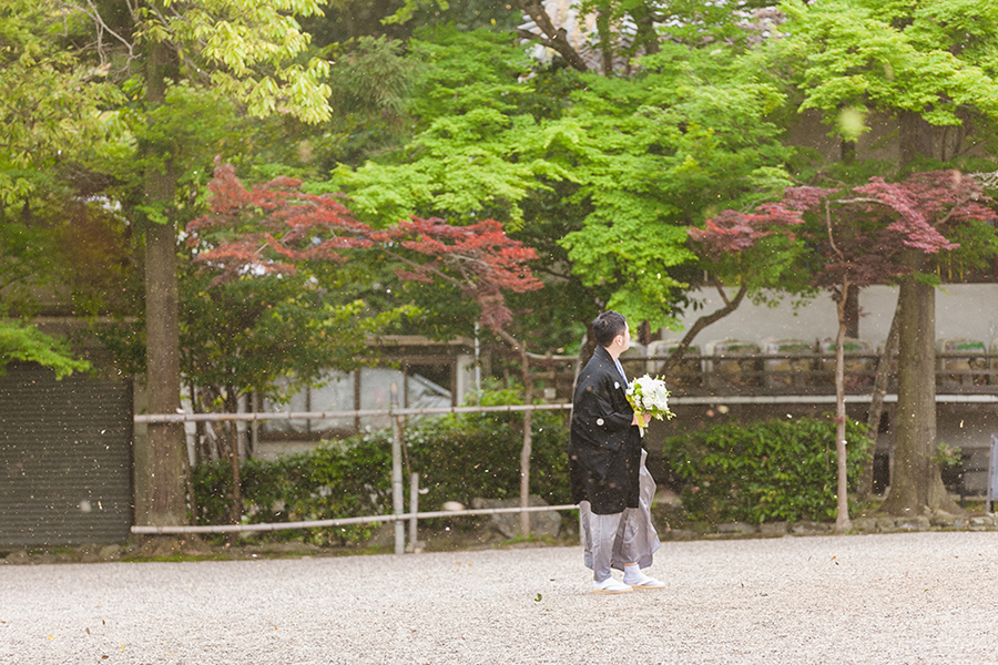 【顔合わせ】紋付袴のご新郎さま、白無垢姿のご新婦さま。始めてみるお互いの晴れ姿。広い境内におふたりらしい時空間が広がります。