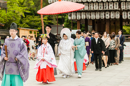 【参進】本殿挙式に向かう。緊張感とともに、一歩一歩10年の重みも感じながら。