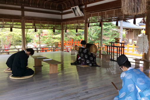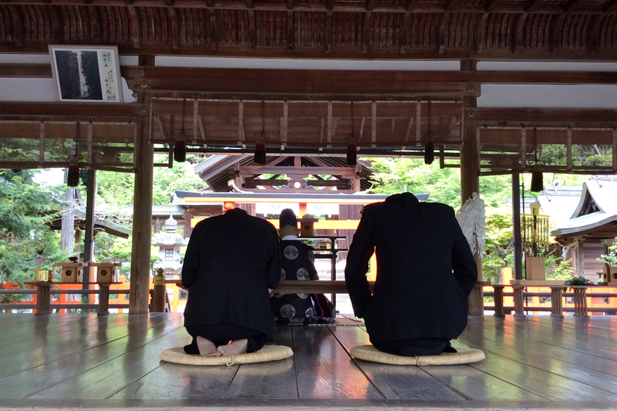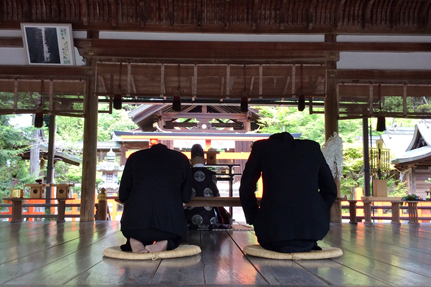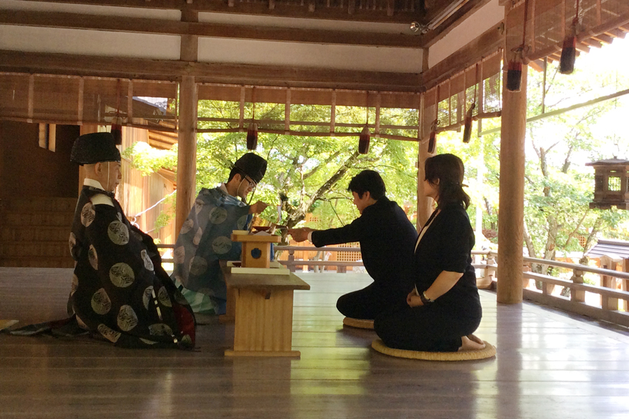 天御柱命・国御柱命(又の名を志那津比古神、志那津比売神)をご祭神とし、風の神様を祀る由緒ある大社です。お二人が出会い、結婚を決め、入籍をしたことを神様へ報告する「結婚奉告祭」を行いました。