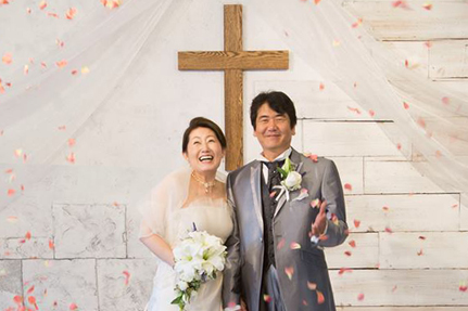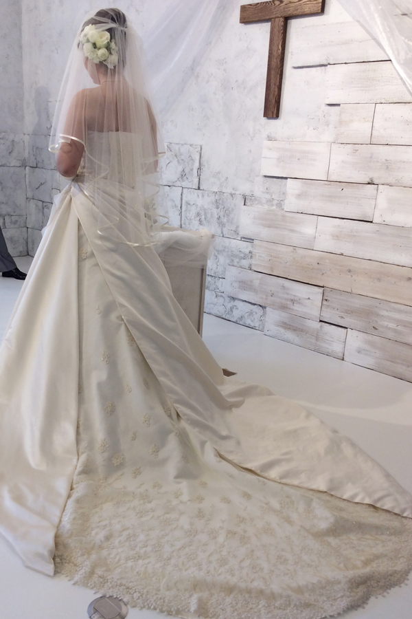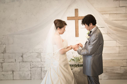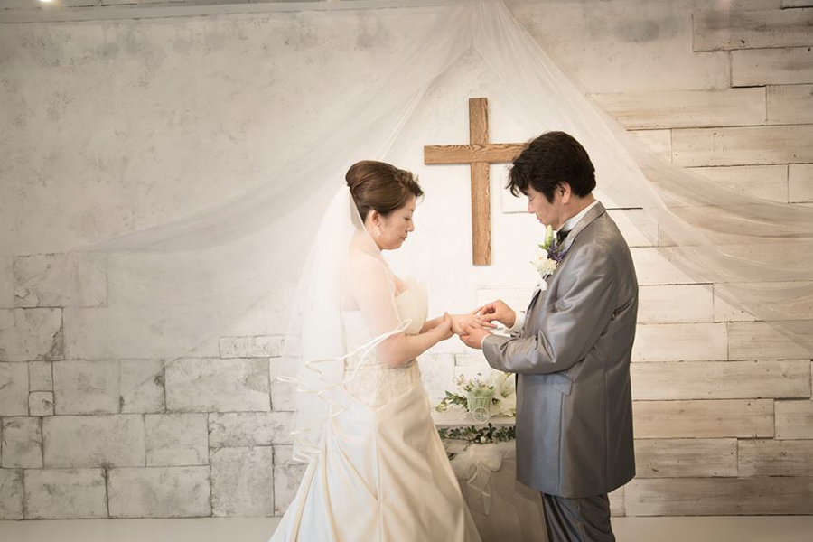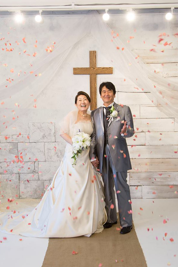 『ウエディングドレスでチャペル風の写真が「夢」やねん。』そうお話してくれたMasakoさん。フォトスタジオを簡易チャペルにアレンジ!ベールアップ、誓いのキス、フラワーシャワーも♥